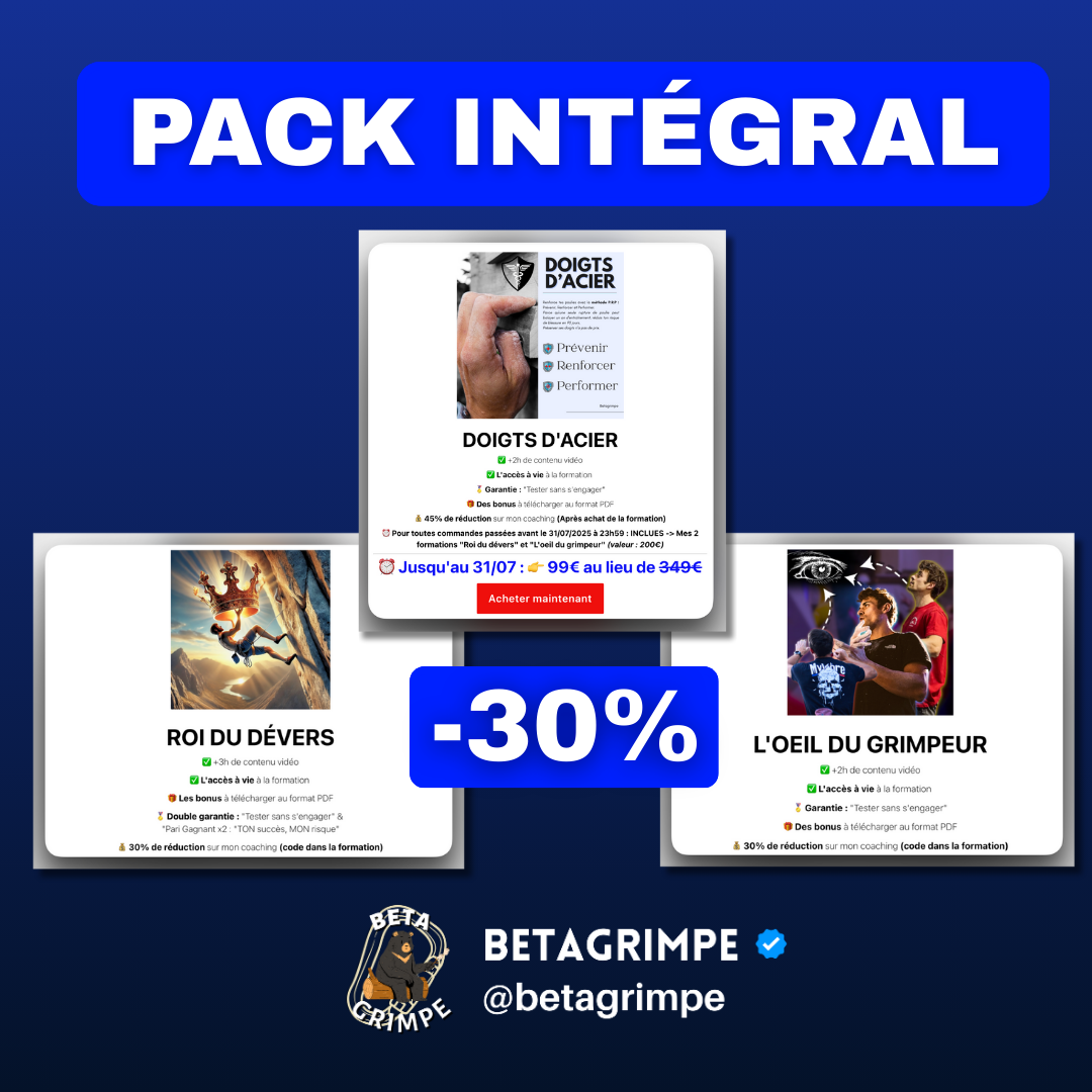 Diplômé d'un MASTER STAPS en MEEF Spé Escalade, et passionné par mon domaine, je crée régulièrement des formations afin de bâtir la plus grande ressource francophone pratique dédiée à l'entraînement, la vulgarisation et la performance en escalade.