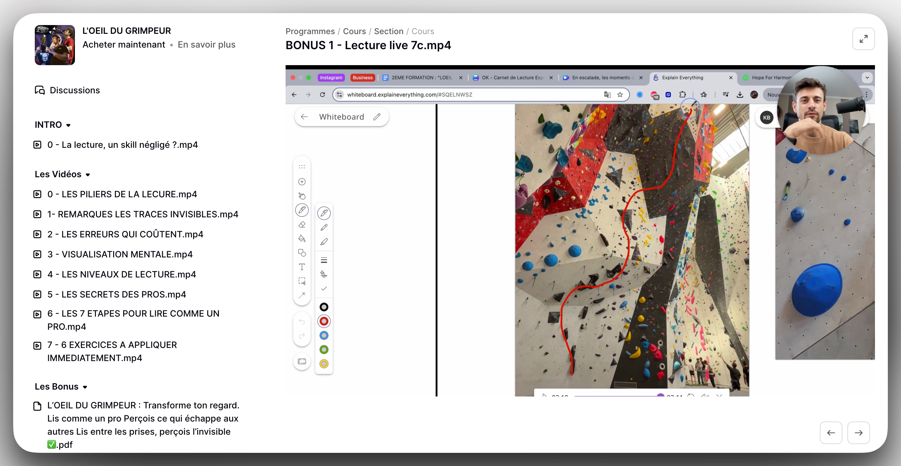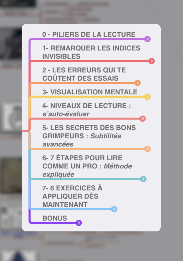 La formation est fournie avec une mindmap récapitulative à télécharger et d'autres ressources pour aller plus loin. Par exemple : Une démo live d'une tentative à vue d'un 7c noir avec une analyse à chaque étape du processus
